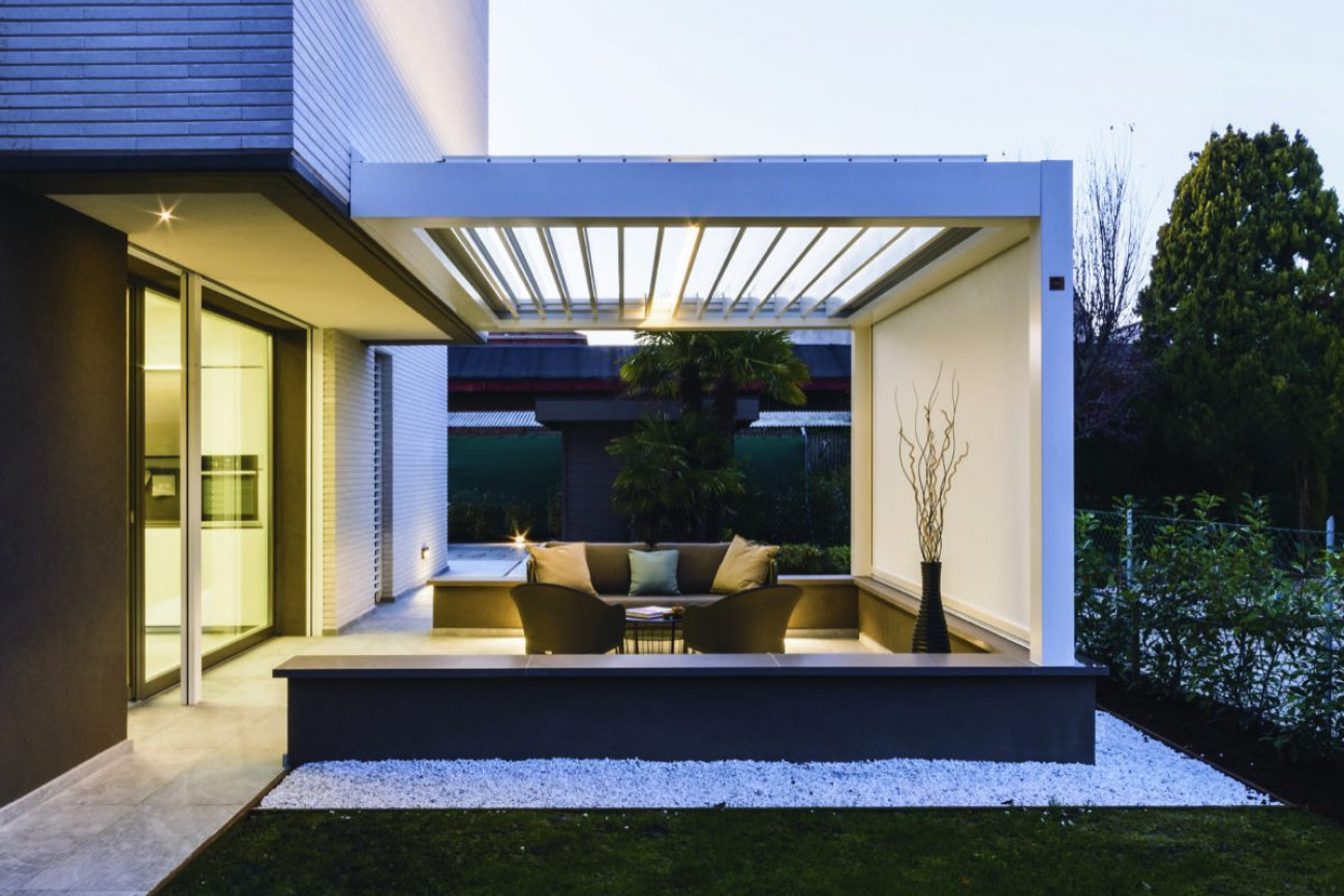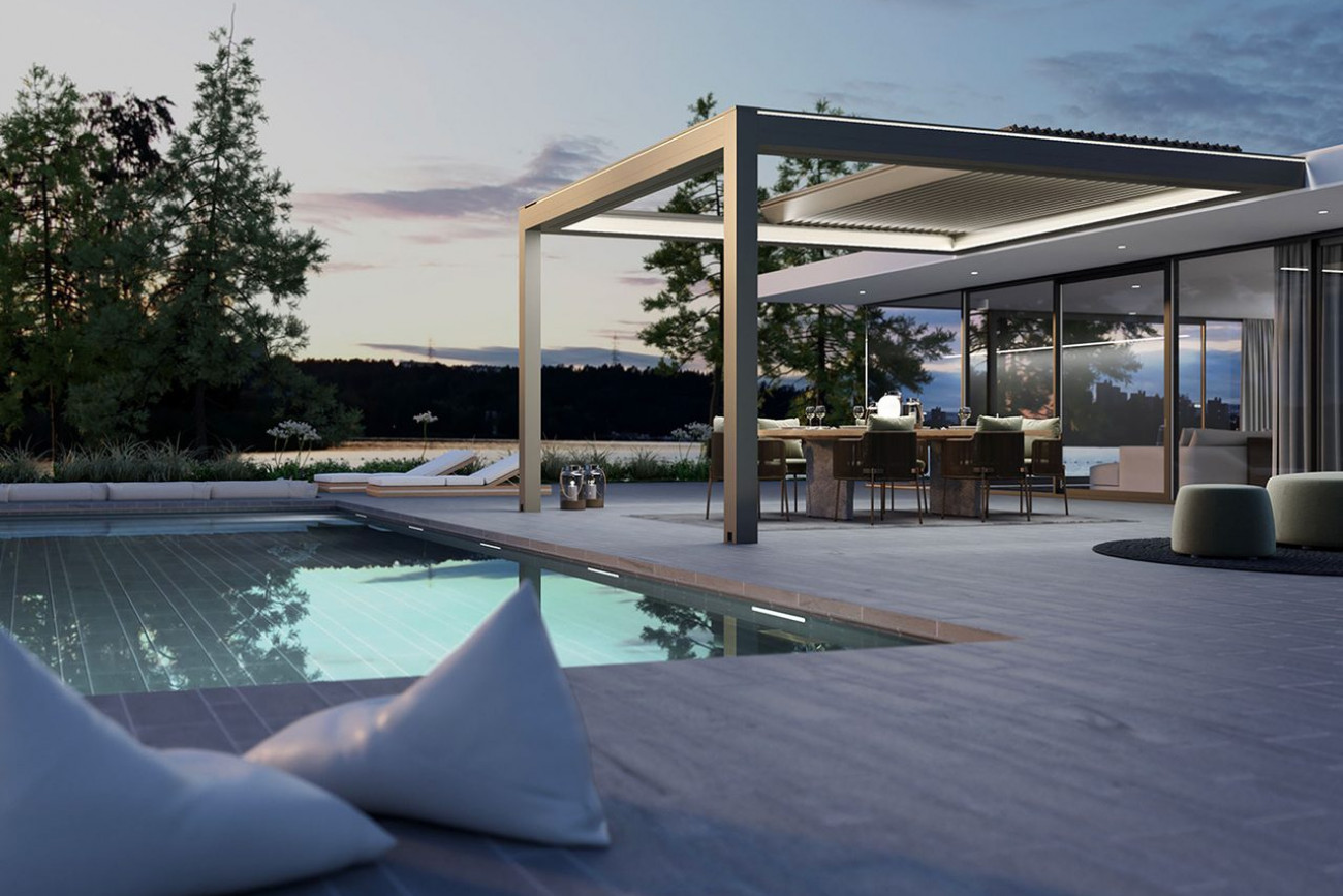 Mit den bioklimatischen Pergolen holen Sie sich eine Oase der Entspannung in Ihren Außenbereich. Die langlebigen Aluminiumstrukturen mit drehbaren oder wegfahrbaren Sonnenschutzlamellen ermöglichen ein unvergleichliches Outdoor-Erlebnis. Diese Überdachungssysteme für Terrassen und Gärten sind modular aufgebaut und können mit seitlichen Screens zu einem geschlossenen Raum erweitert werden, der Ihren Wohnraum nach draußen verlagert.