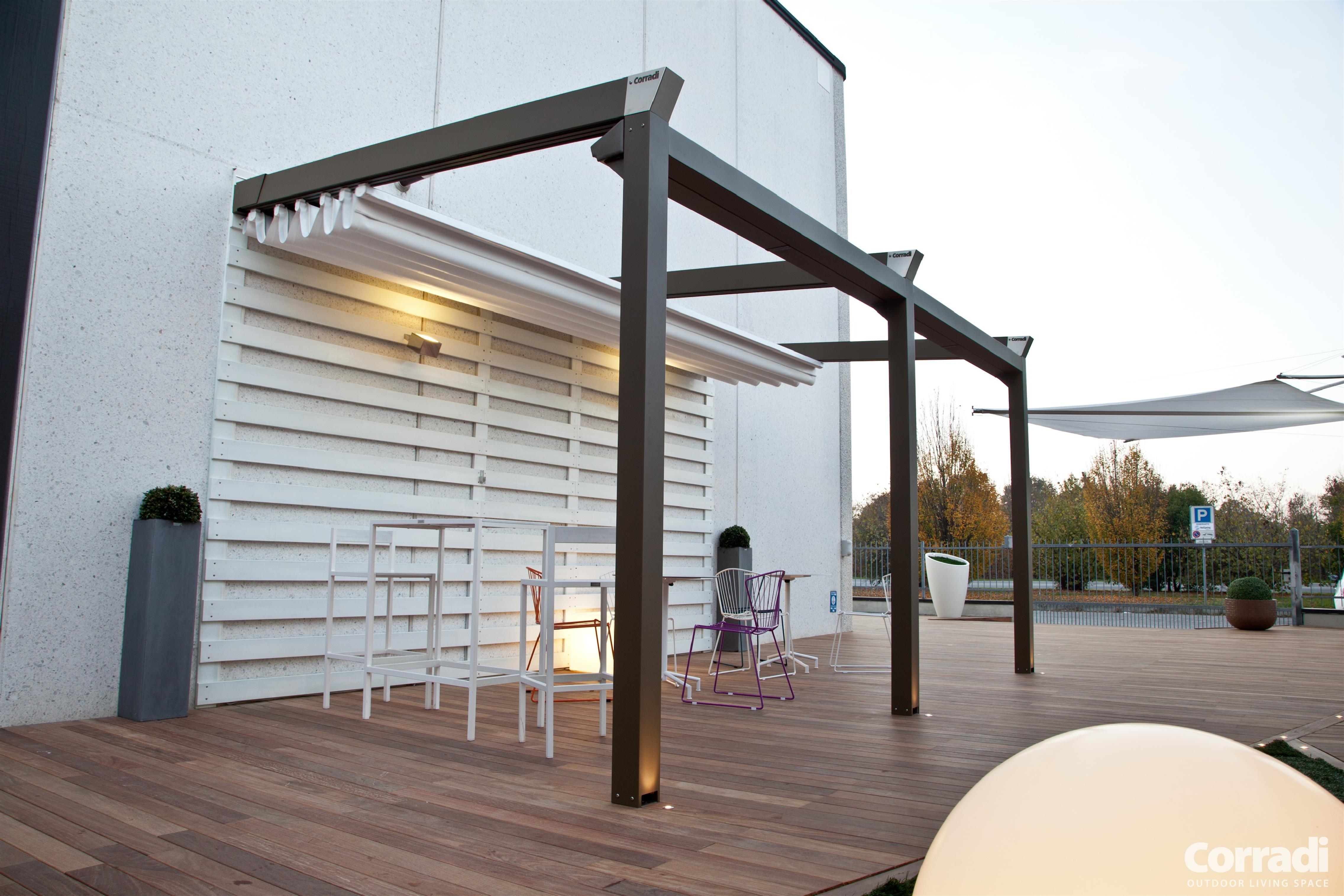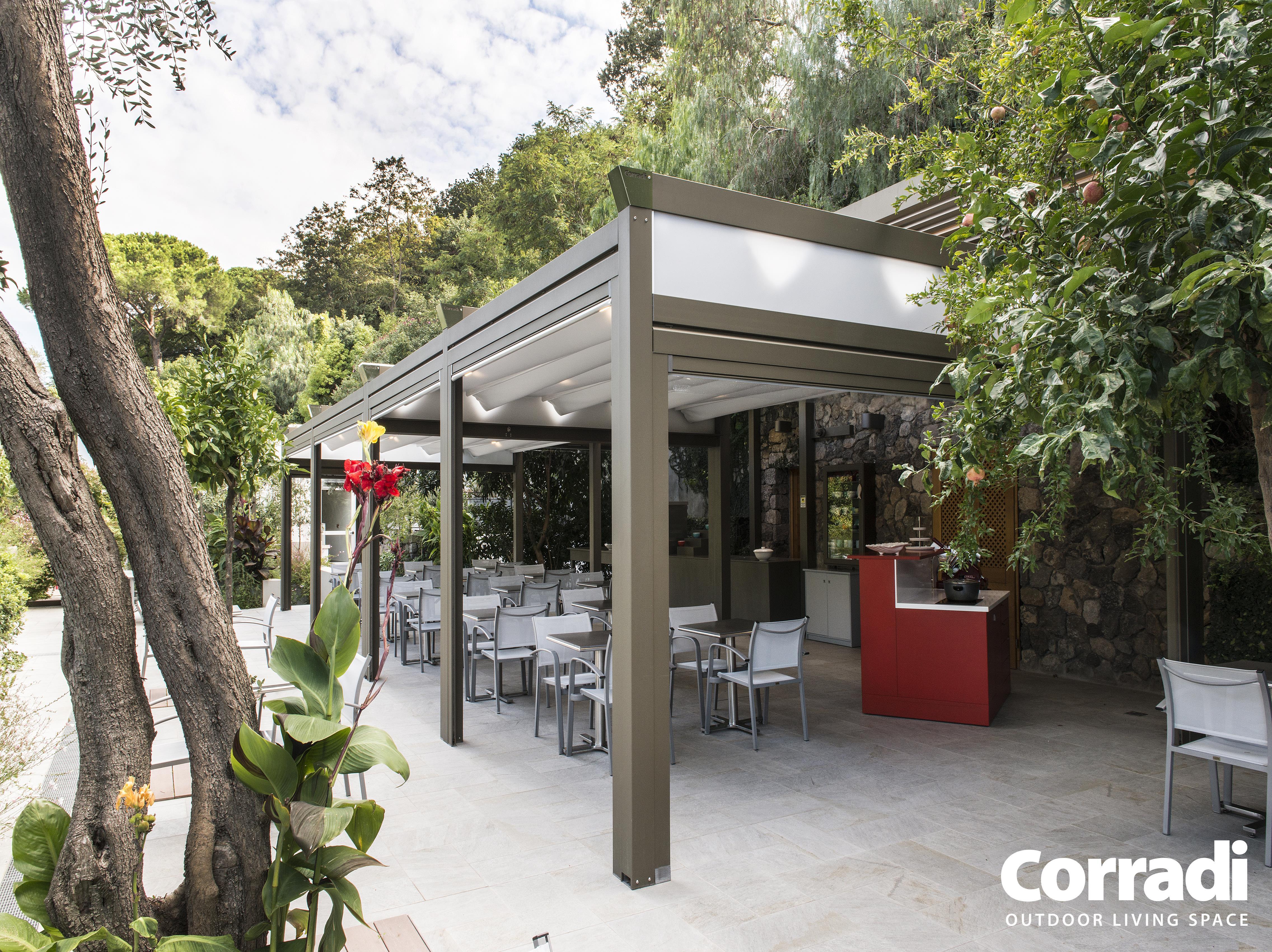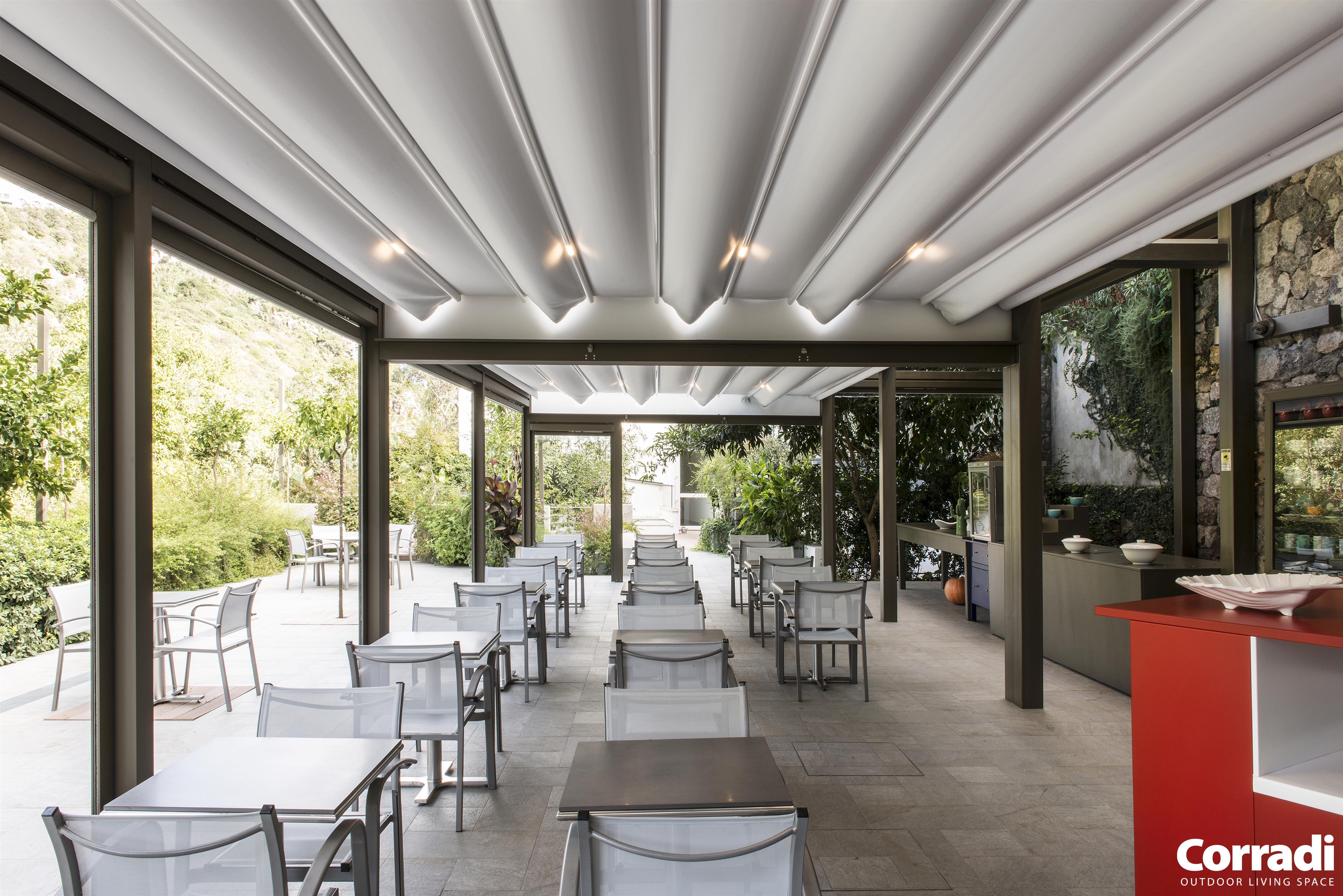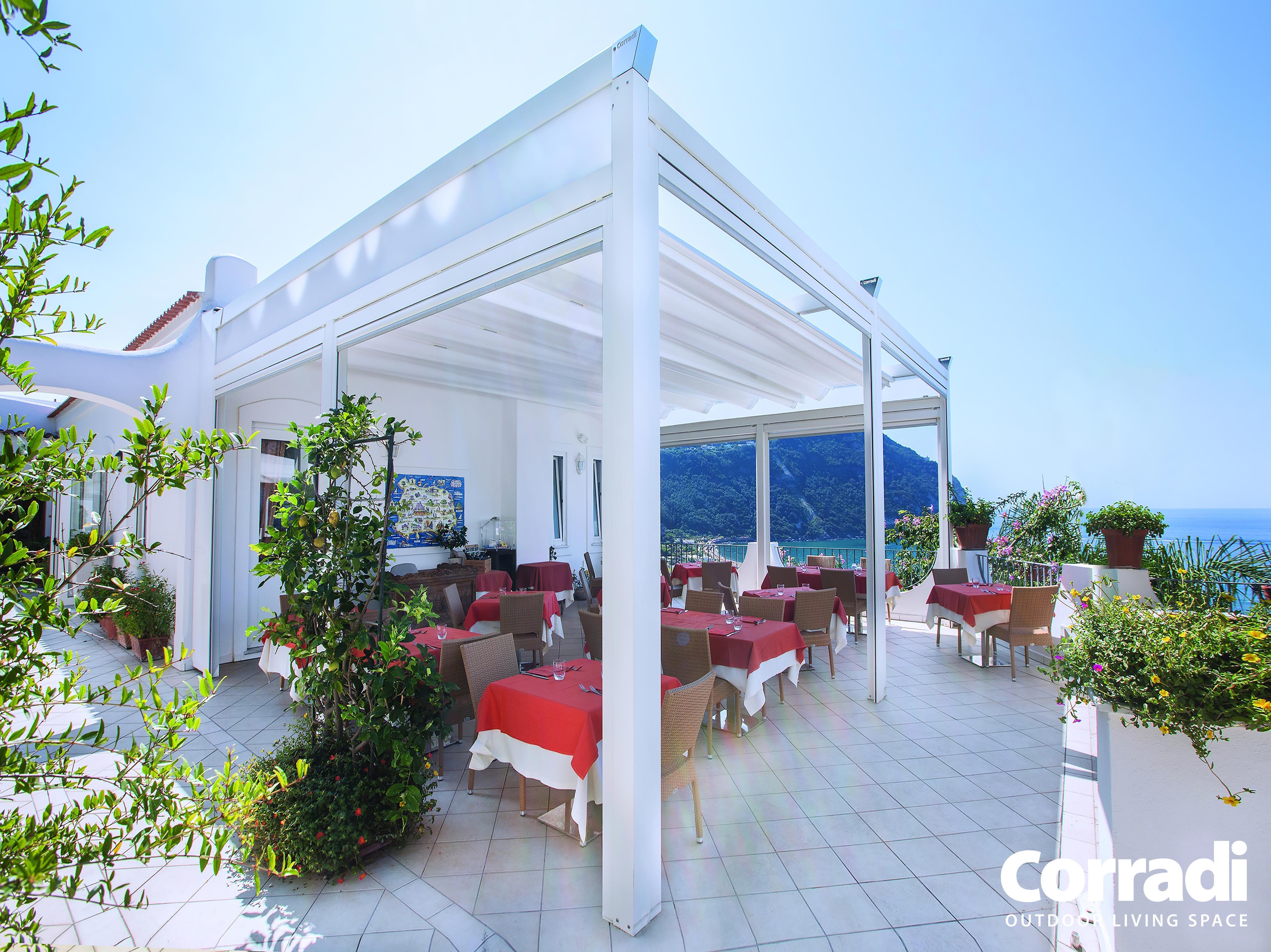 B-Space ist eine, an einer Unterkonstruktion befestigte Pergotenda ® aus Aluminium mit einer Auskragung bis zu 9 m. Sie ist also für die Überdachung großer Flächen entwickelt worden, ideal auch für den Gastronomiebereich.