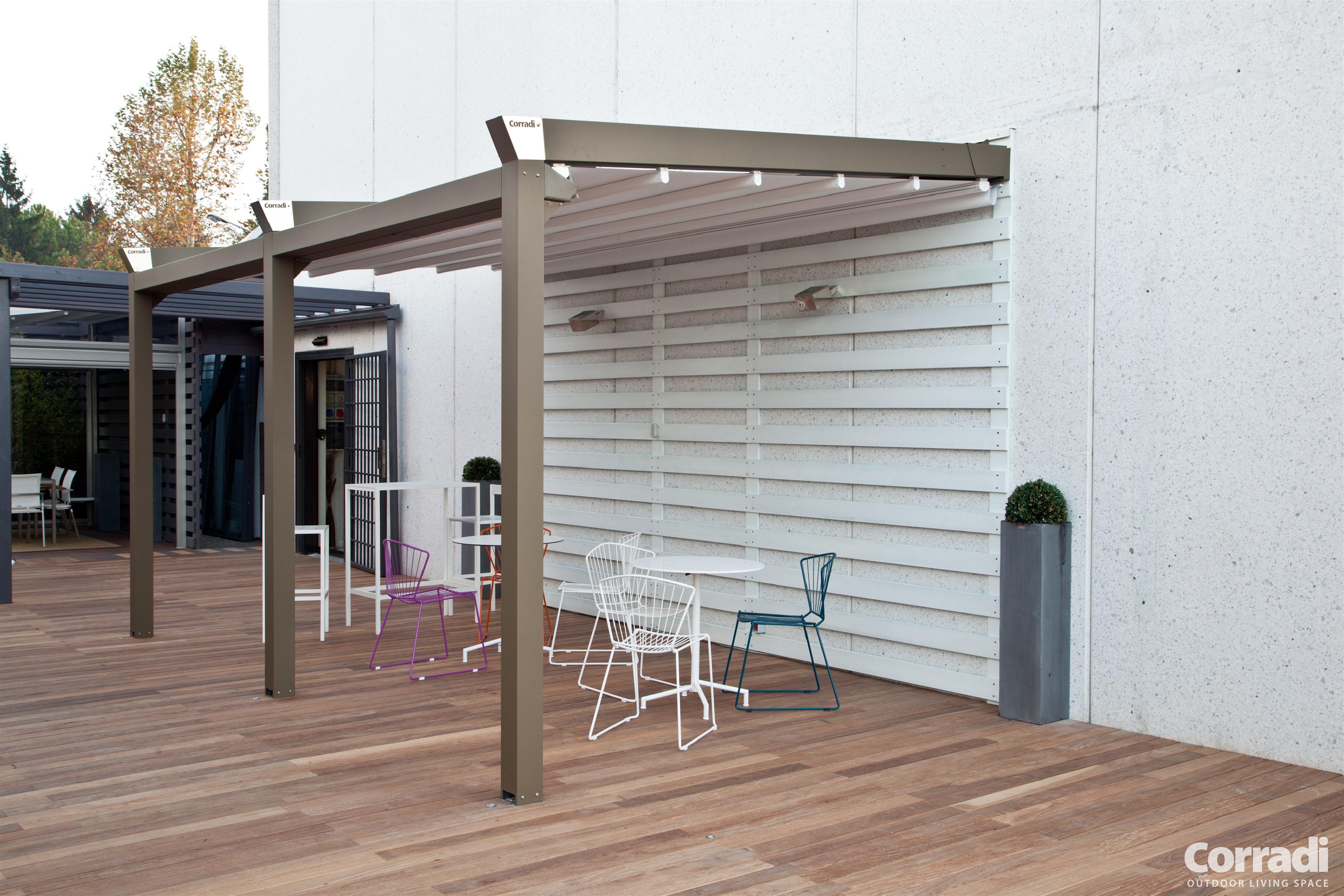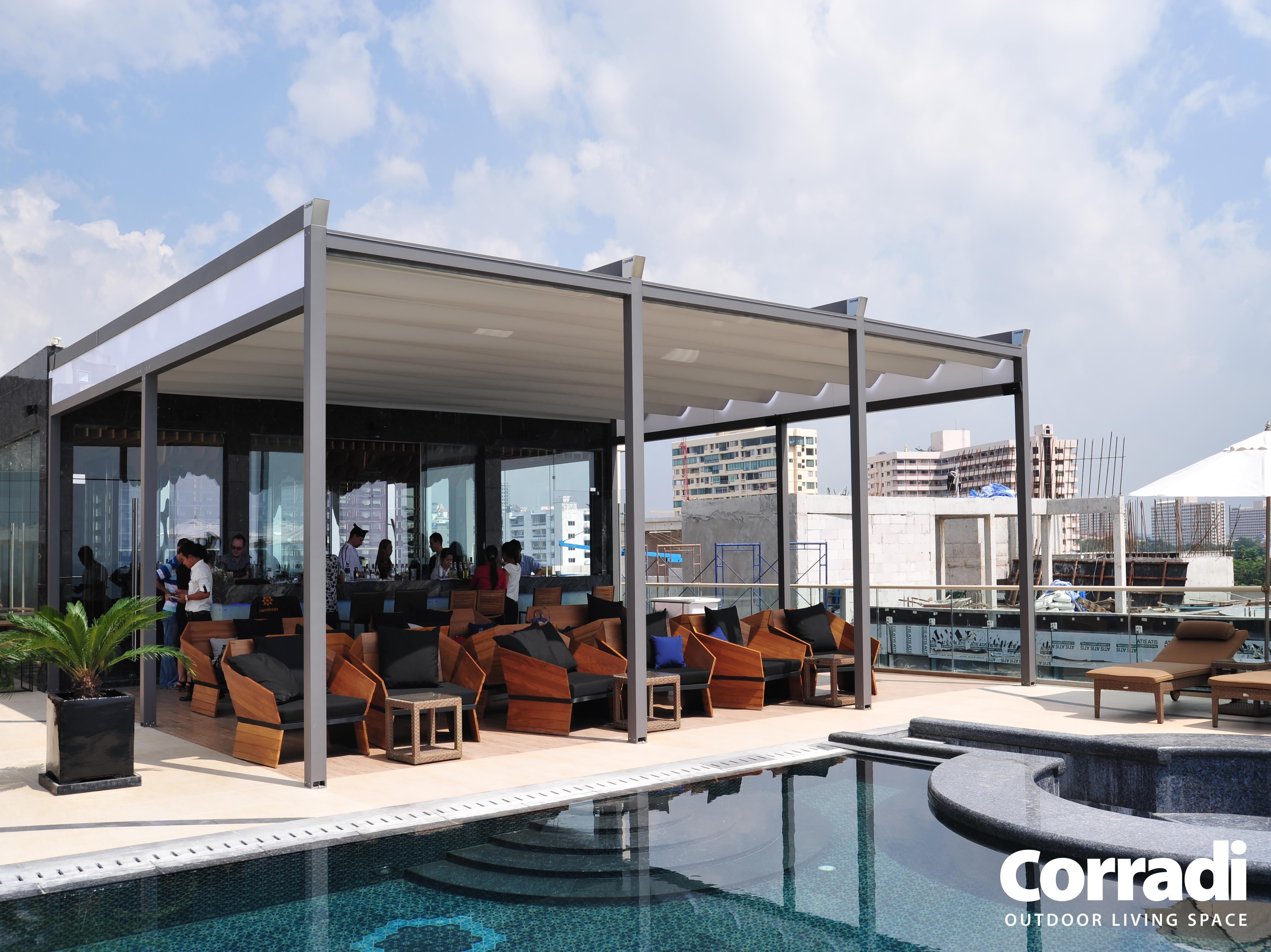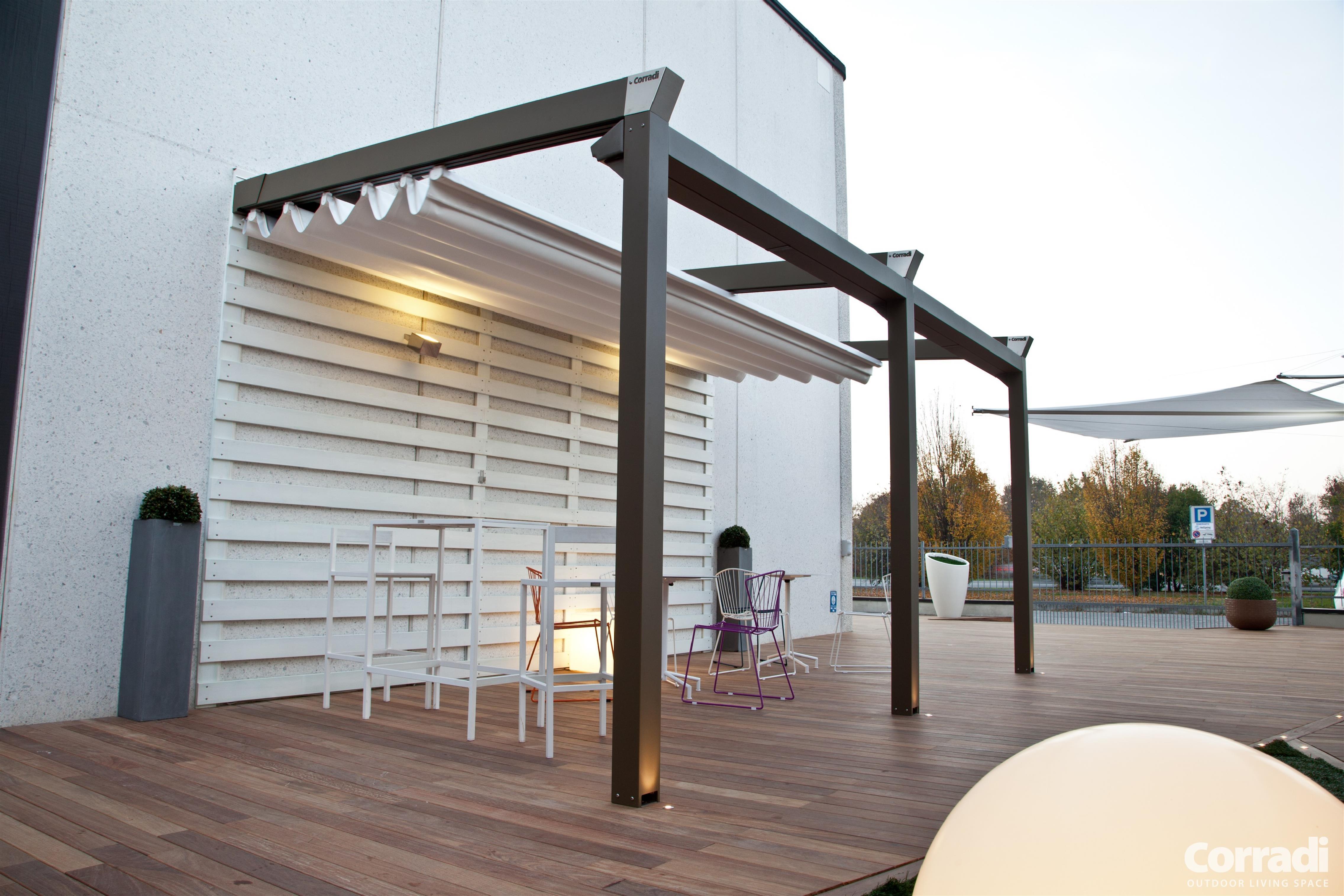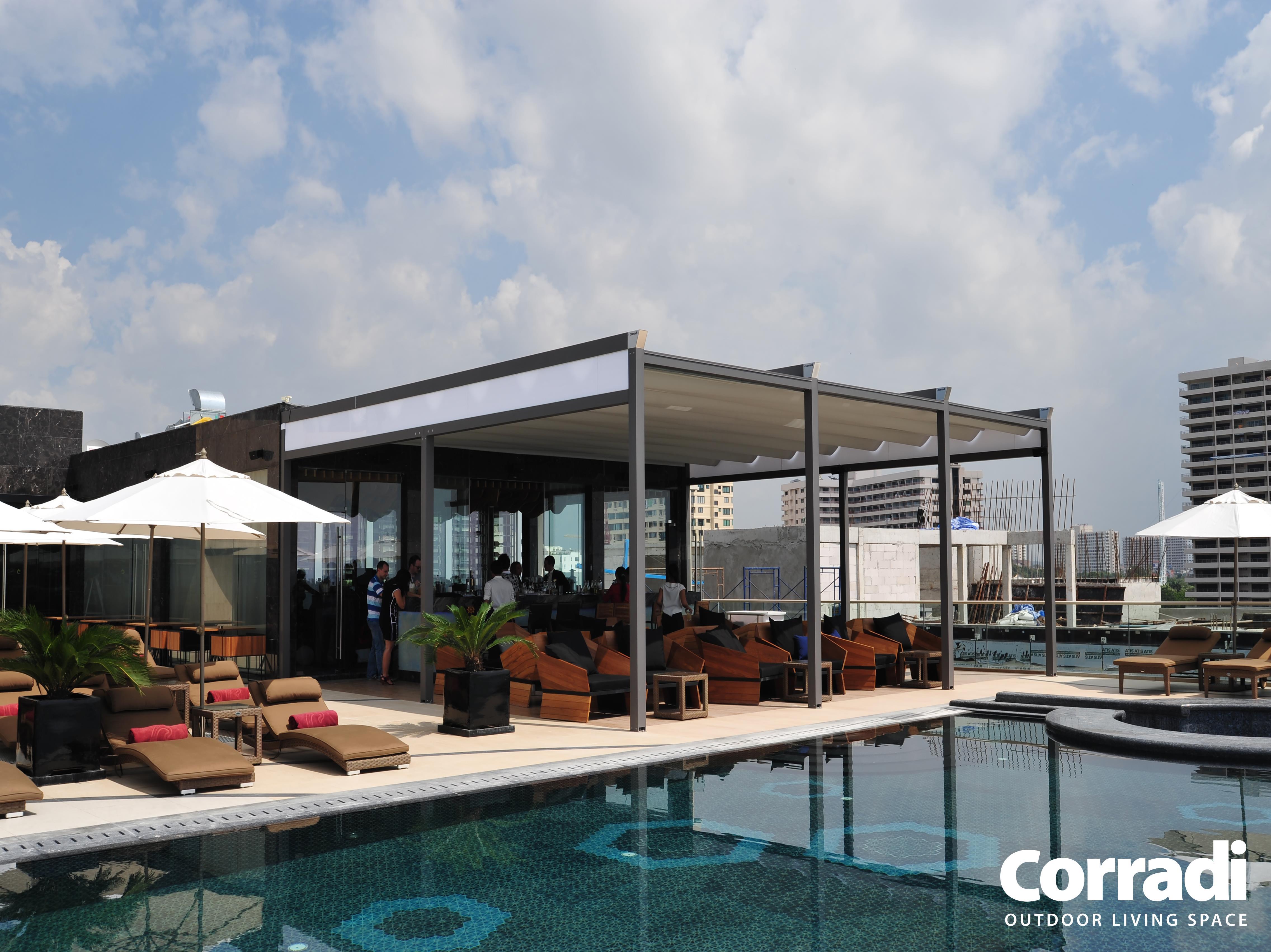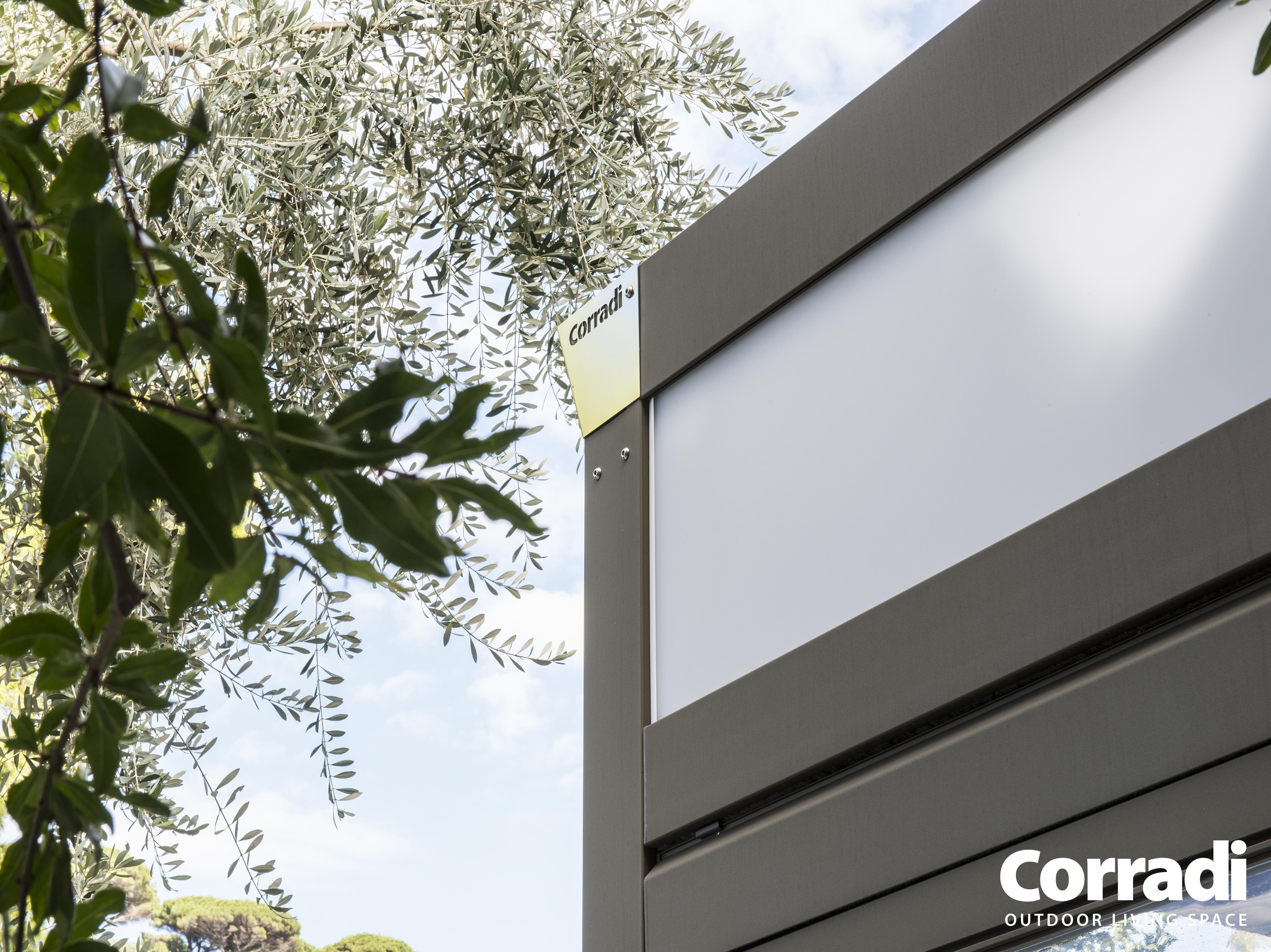 B-Space ist eine, an einer Unterkonstruktion befestigte Pergotenda ® aus Aluminium mit einer Auskragung bis zu 9 m. Sie ist also für die Überdachung großer Flächen entwickelt worden, ideal auch für den Gastronomiebereich.