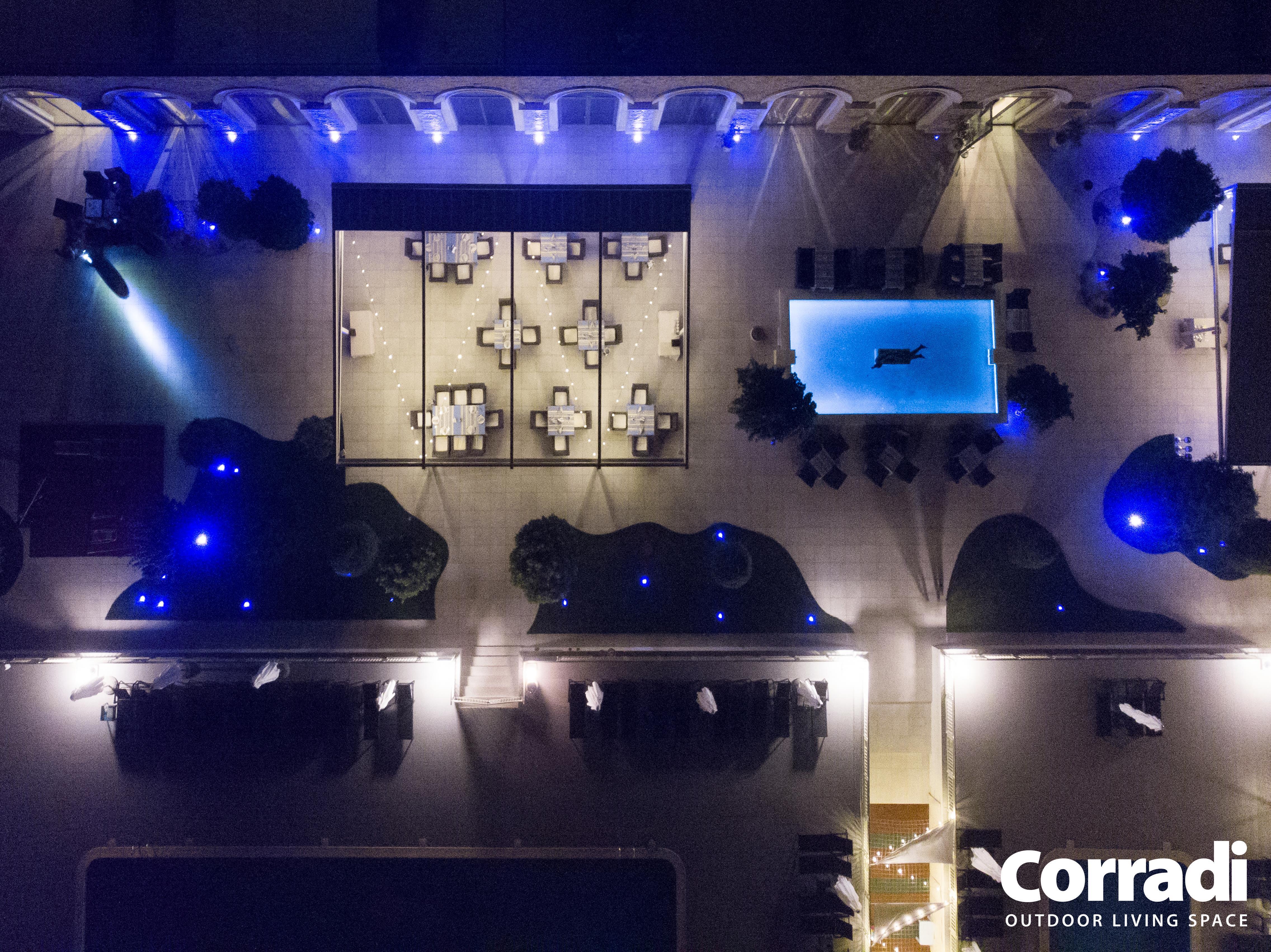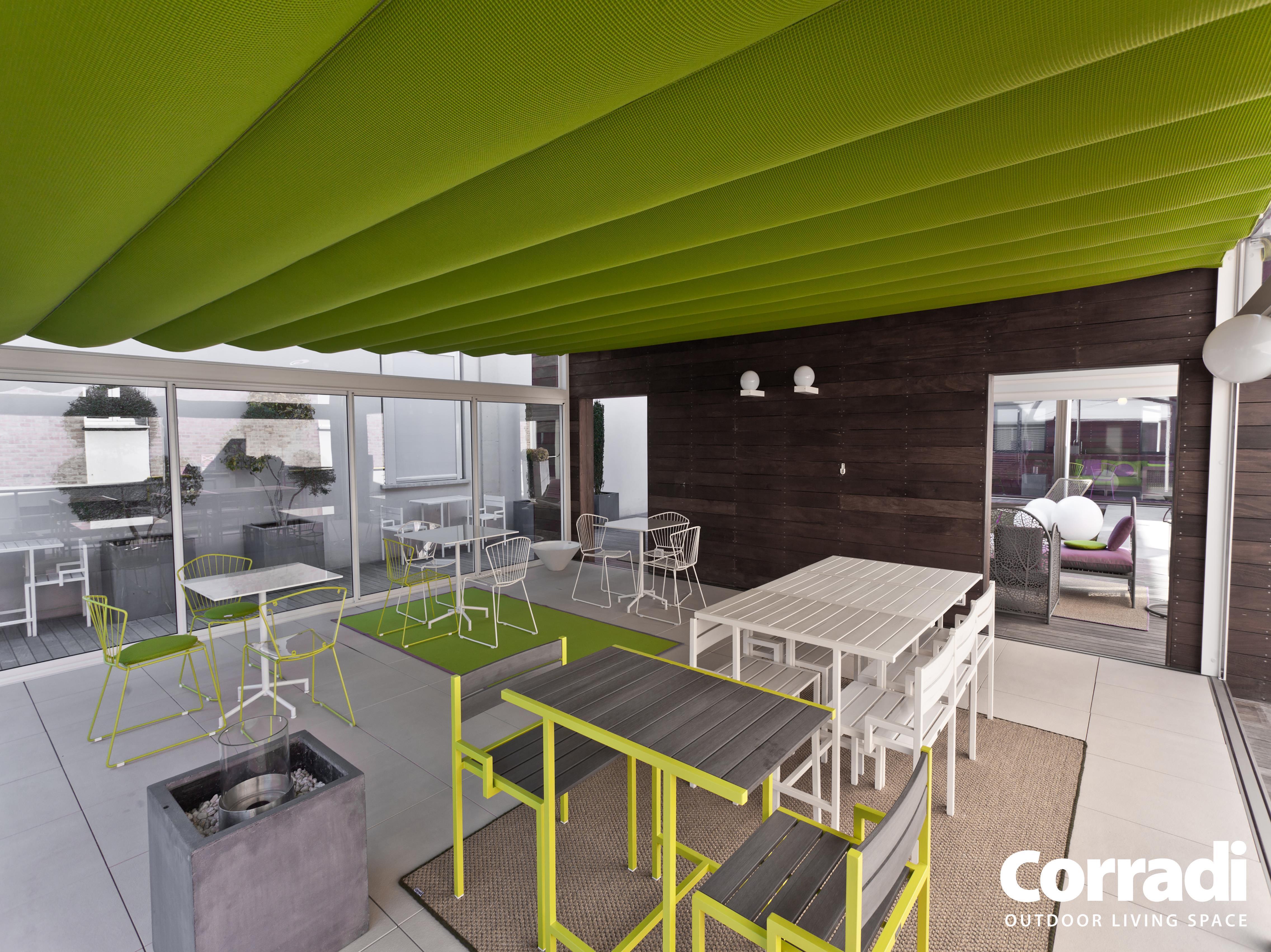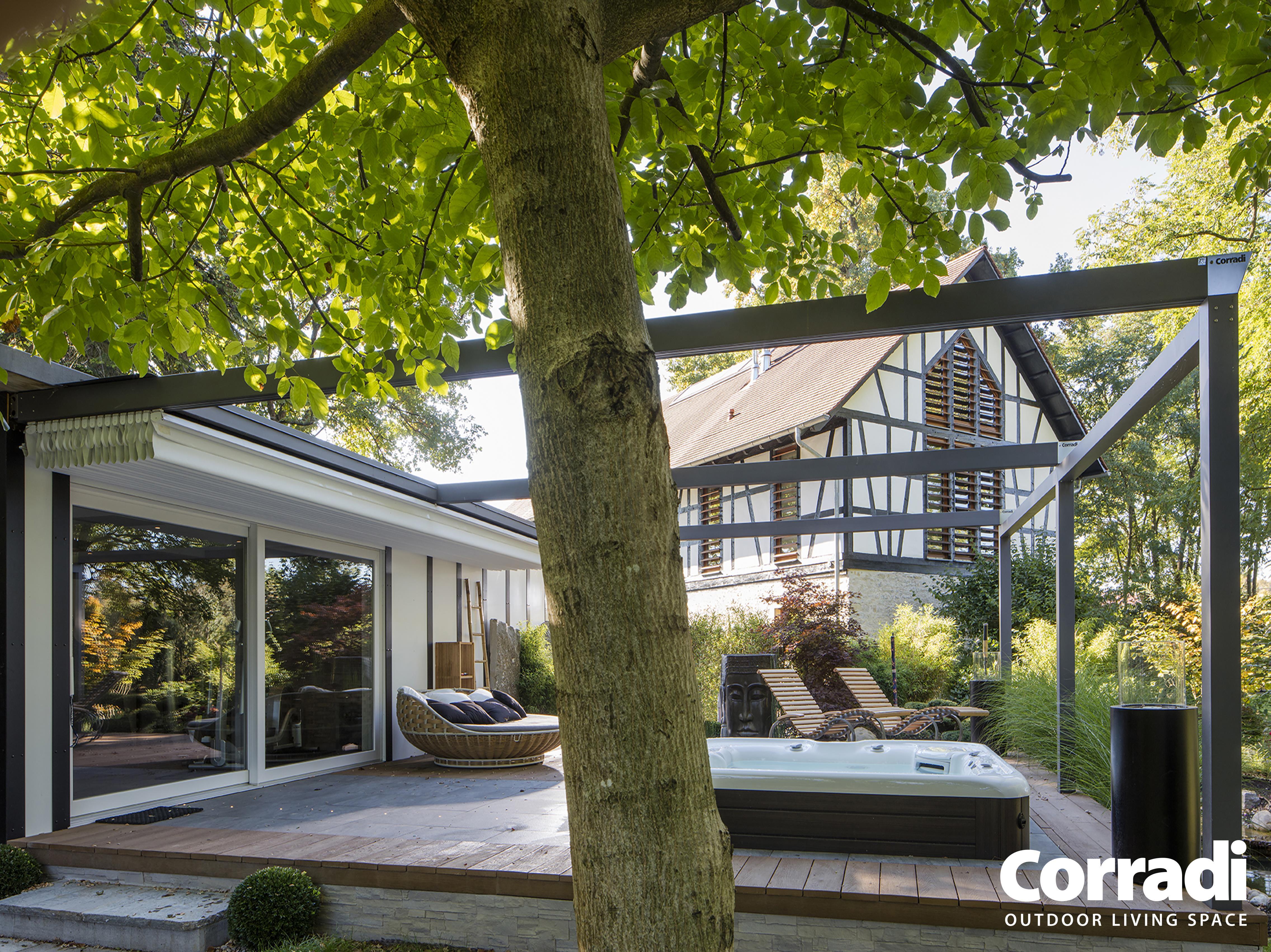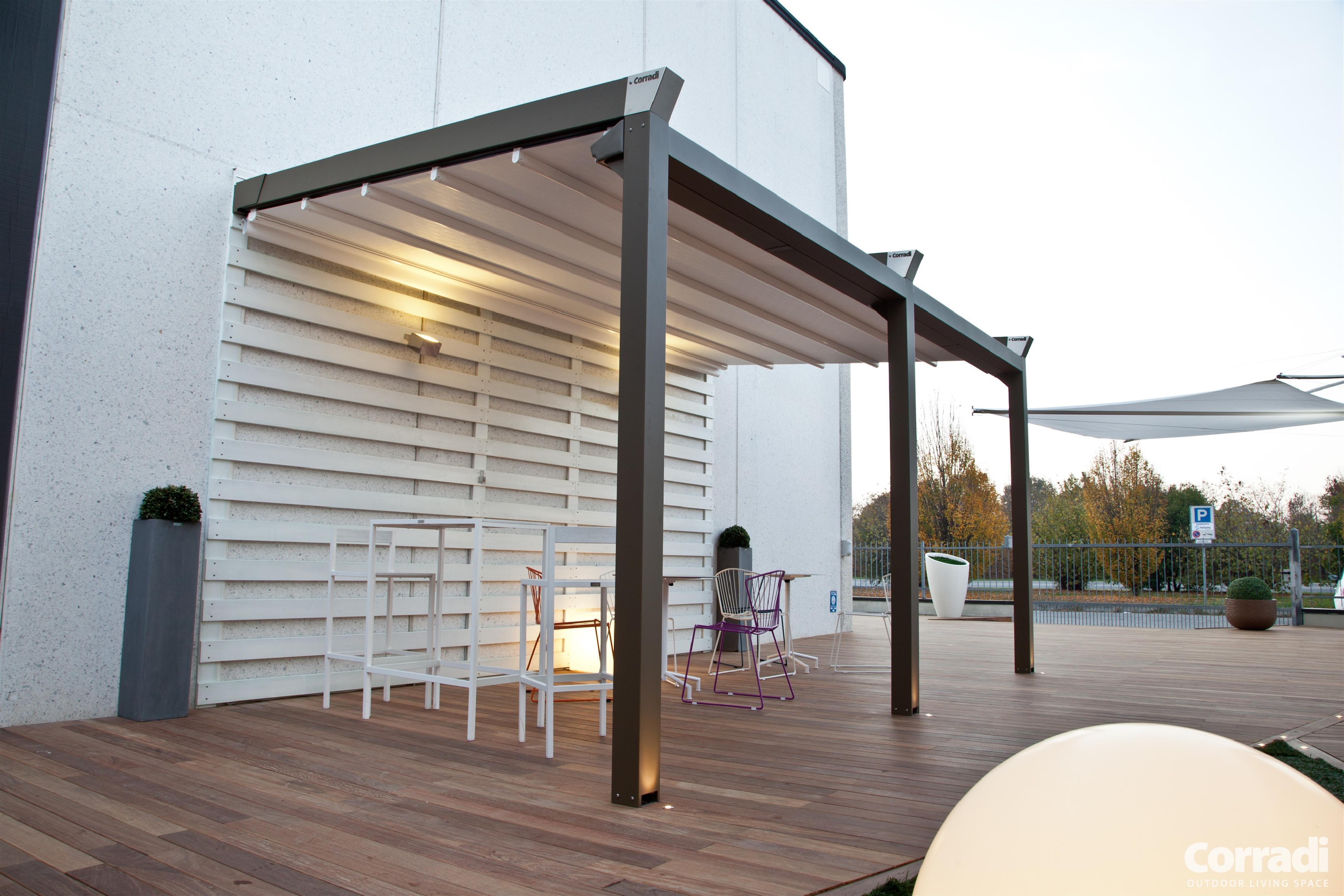 B-Space ist eine, an einer Unterkonstruktion befestigte Pergotenda ® aus Aluminium mit einer Auskragung bis zu 9 m. Sie ist also für die Überdachung großer Flächen entwickelt worden, ideal auch für den Gastronomiebereich.